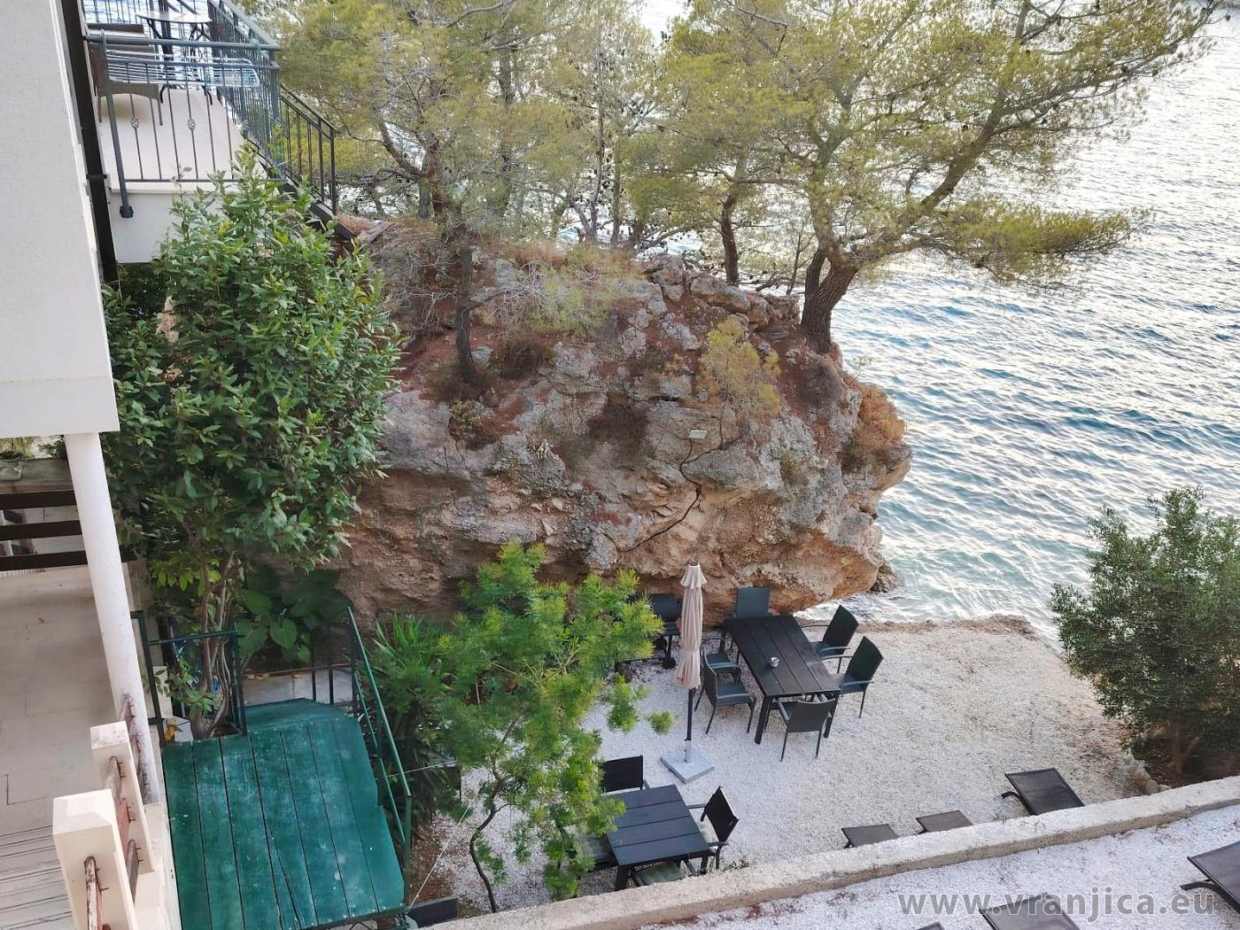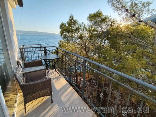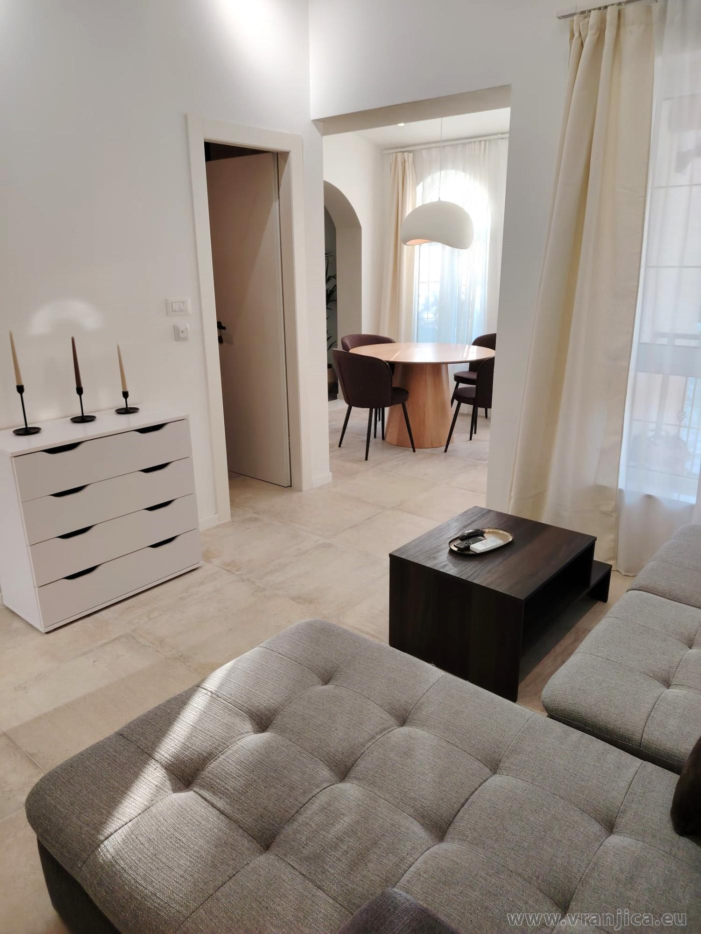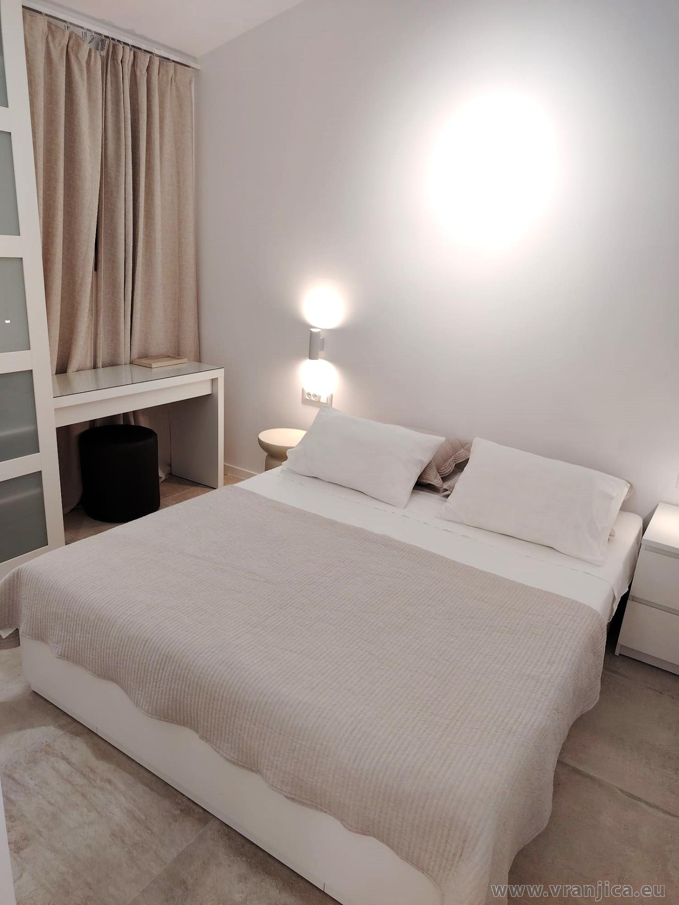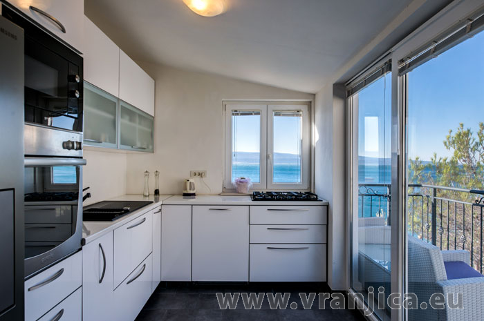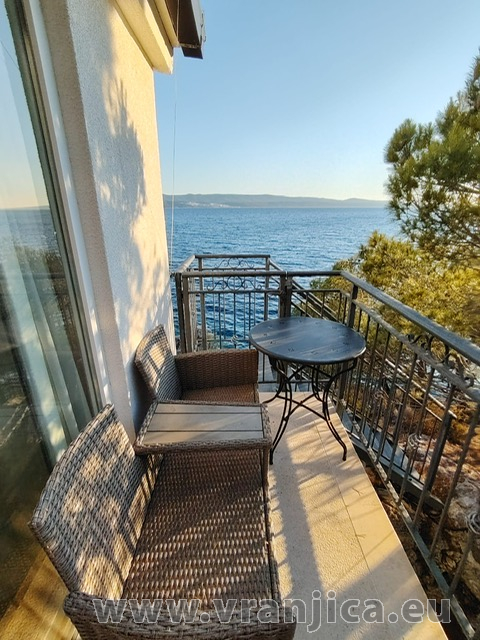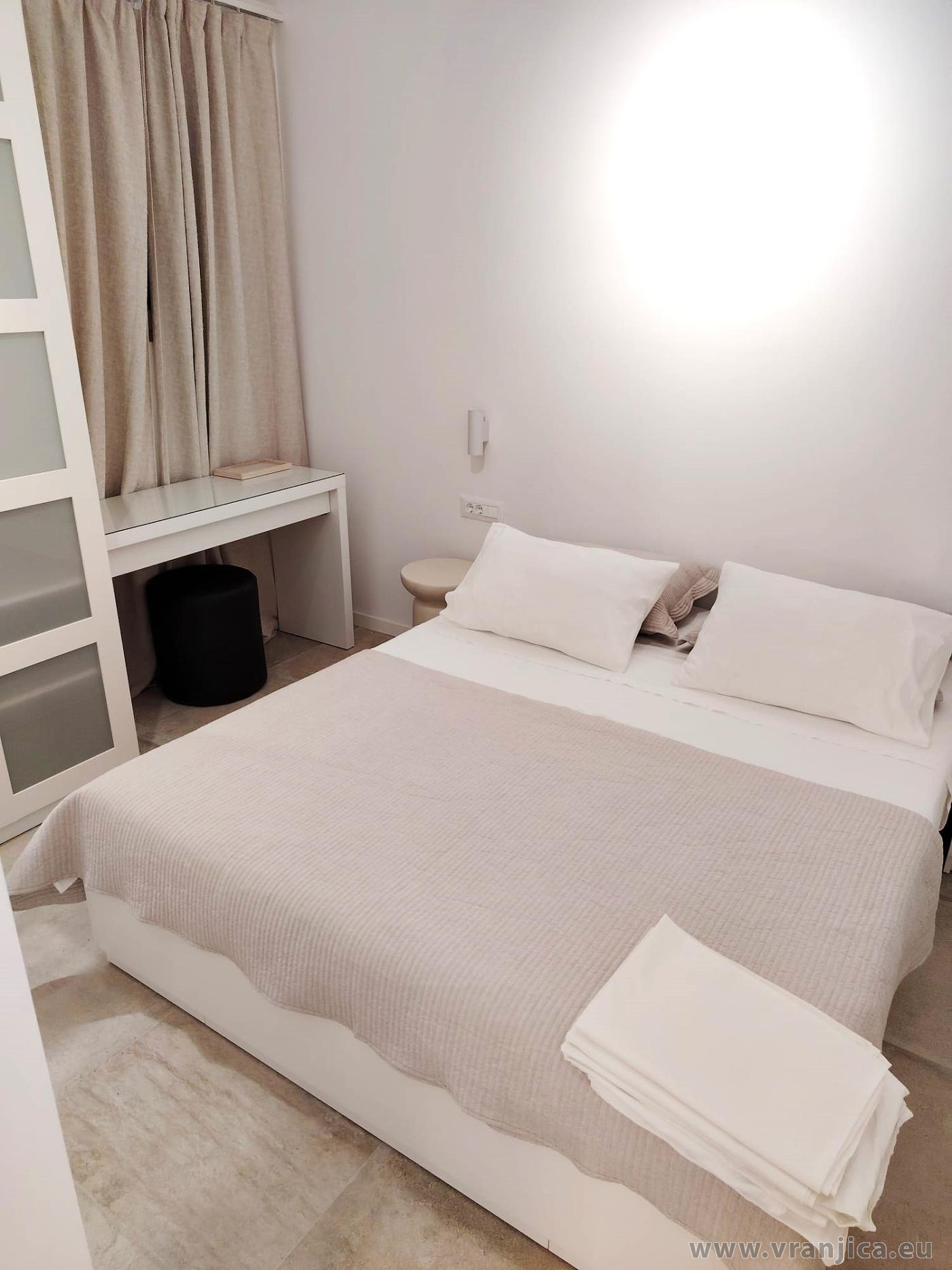 AP1 (2+2) pro 4 osoby: 2. patro, levá boční strana vily, 1 ložnice (dvoulůžko 160x200 cm), obývací pokoj + kuchyně (1x rozkládací dvoulůžko 160x210 cm), koupelna (WC, sprcha), terasa s výhledem na moře, plocha 55 m2 + boční terasa 5 m2. Informace o objektu ZDE.