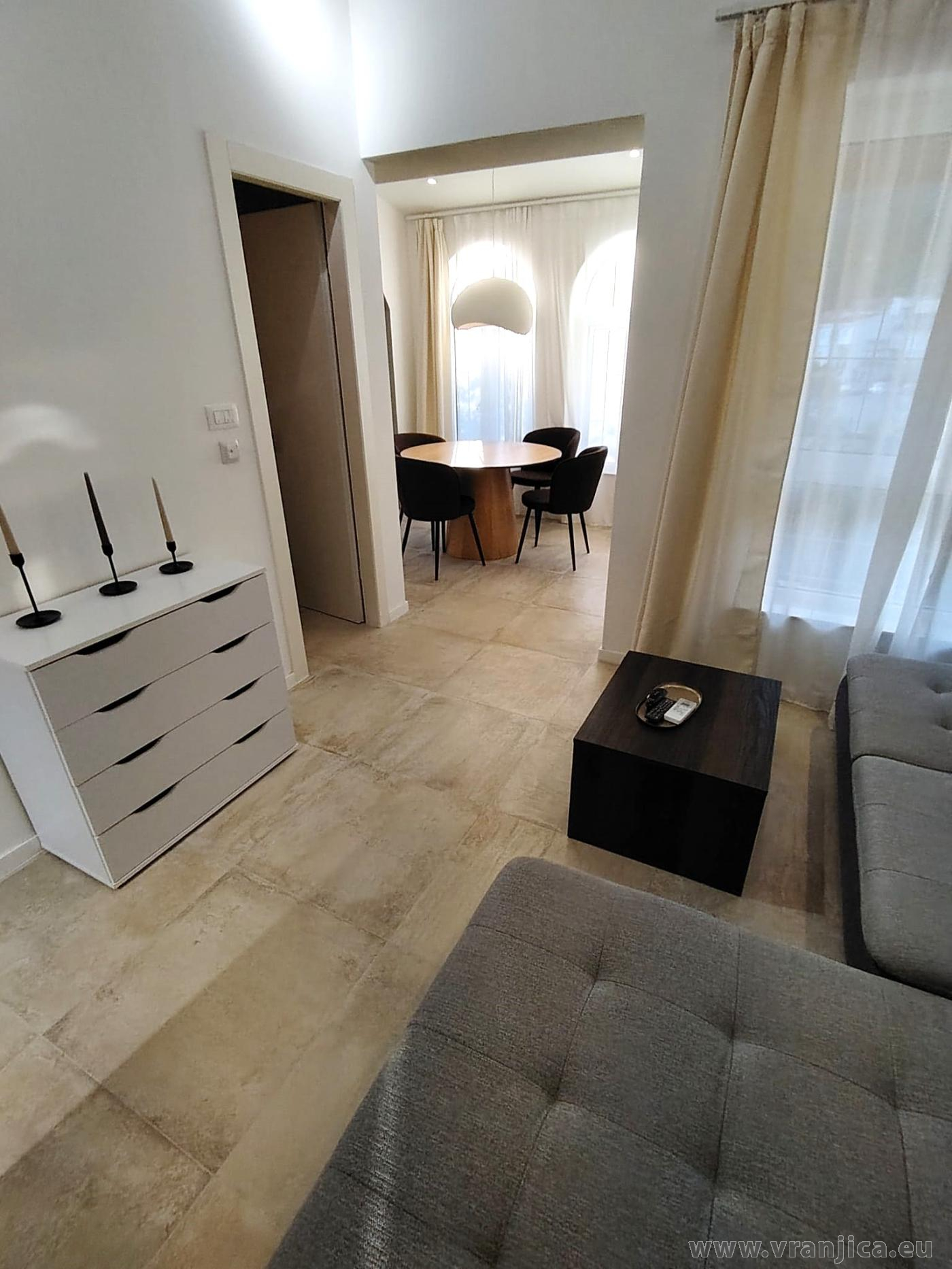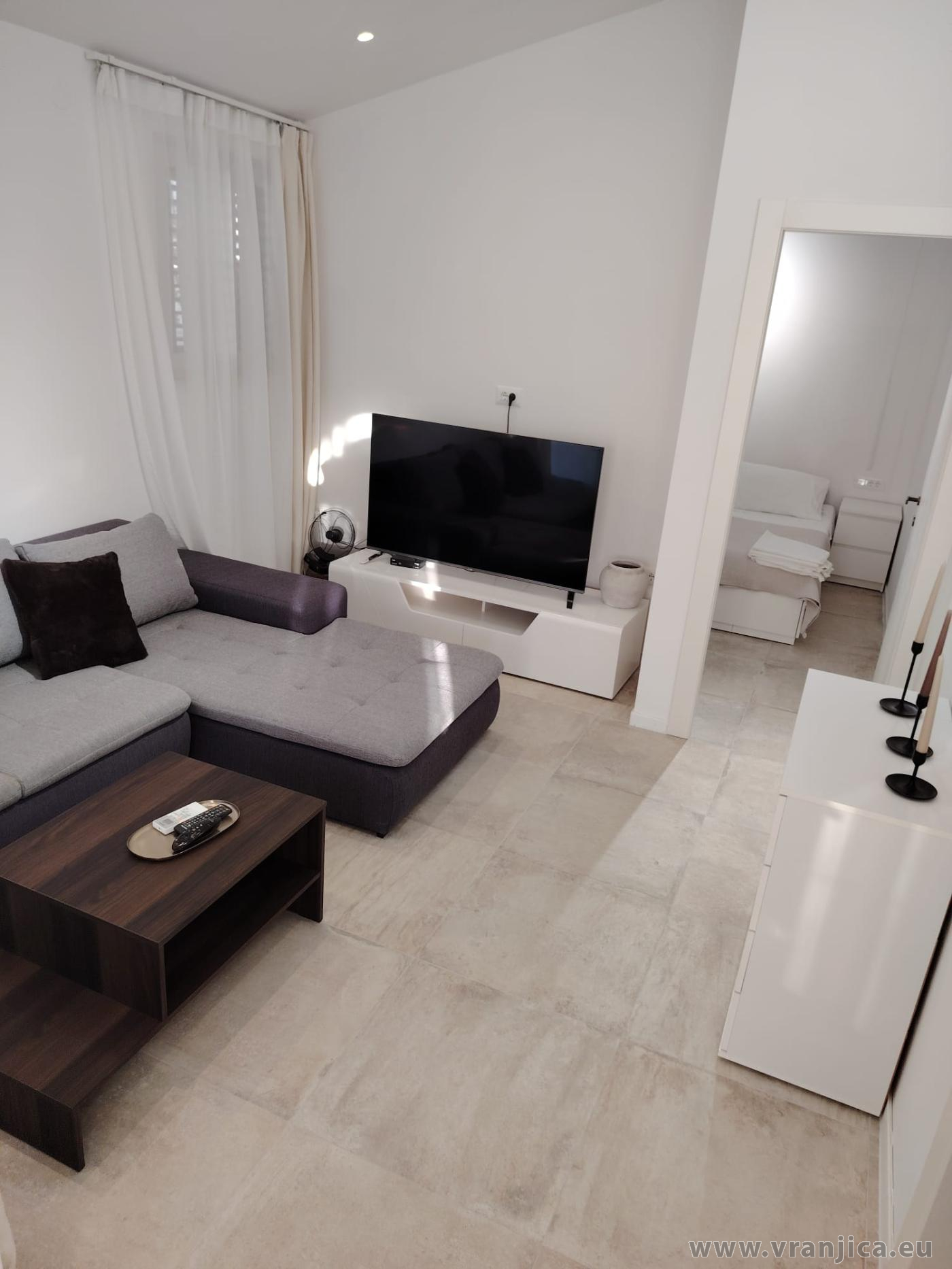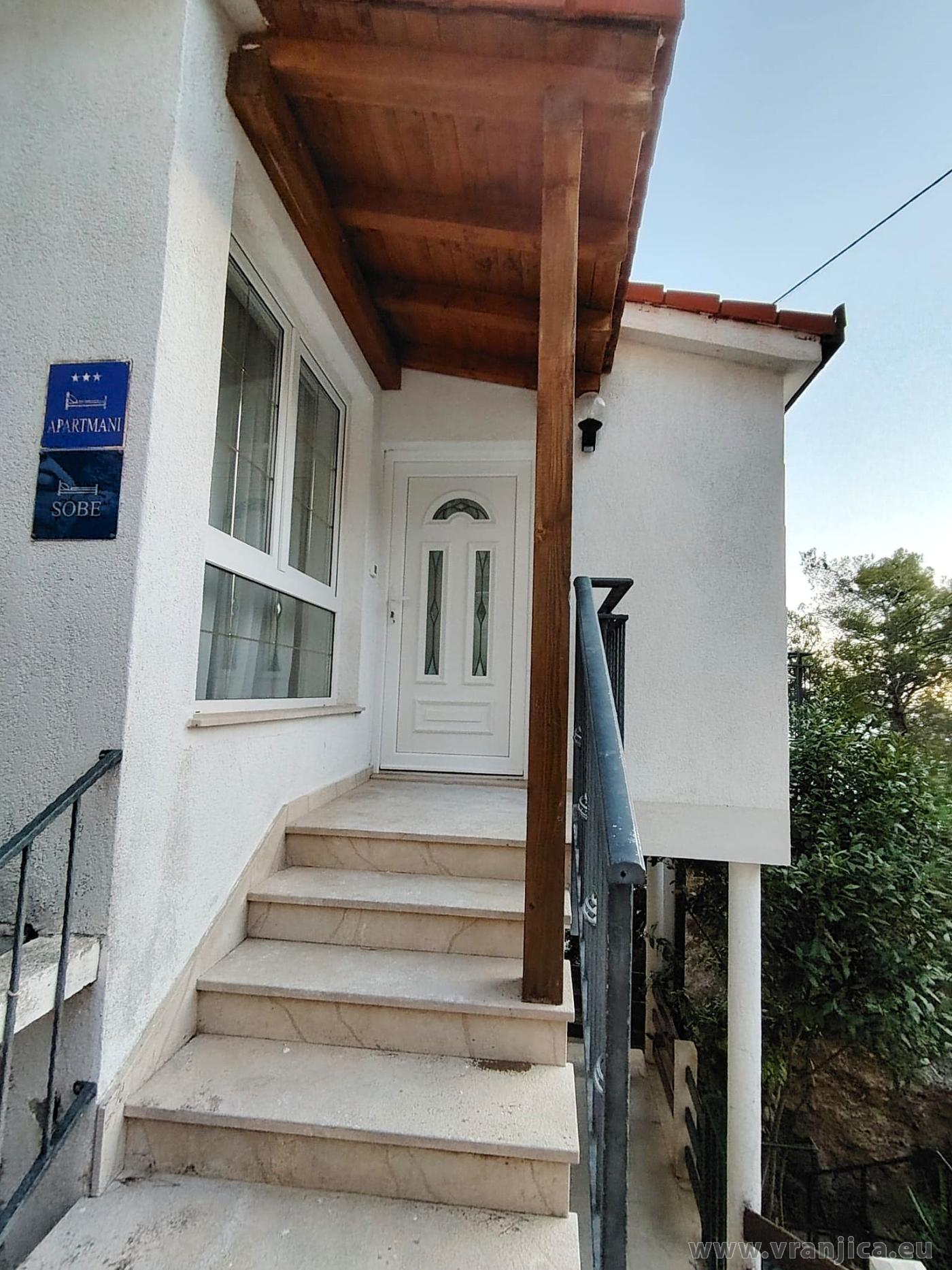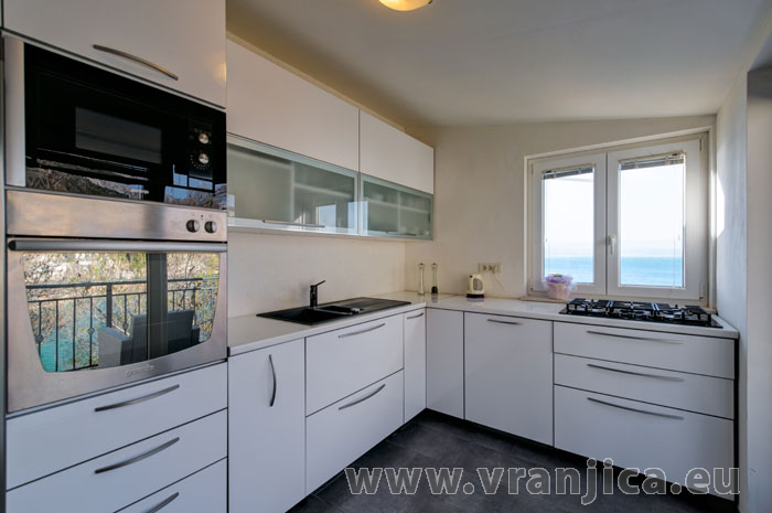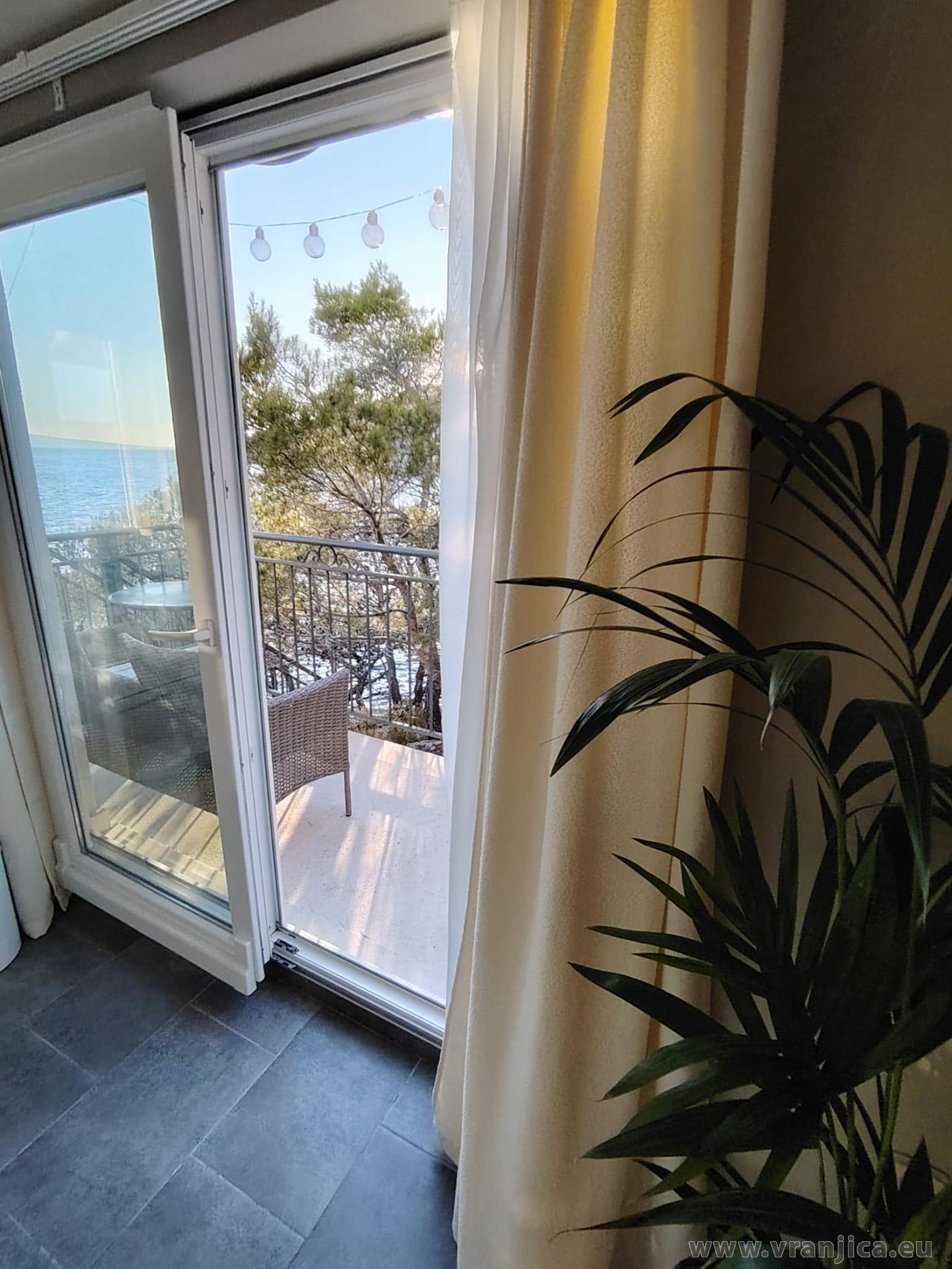 AP1 (2+2) pro 4 osoby: 2. patro, levá boční strana vily, 1 ložnice (dvoulůžko 160x200 cm), obývací pokoj + kuchyně (1x rozkládací dvoulůžko 160x210 cm), koupelna (WC, sprcha), terasa s výhledem na moře, plocha 55 m2 + boční terasa 5 m2. Informace o objektu ZDE.