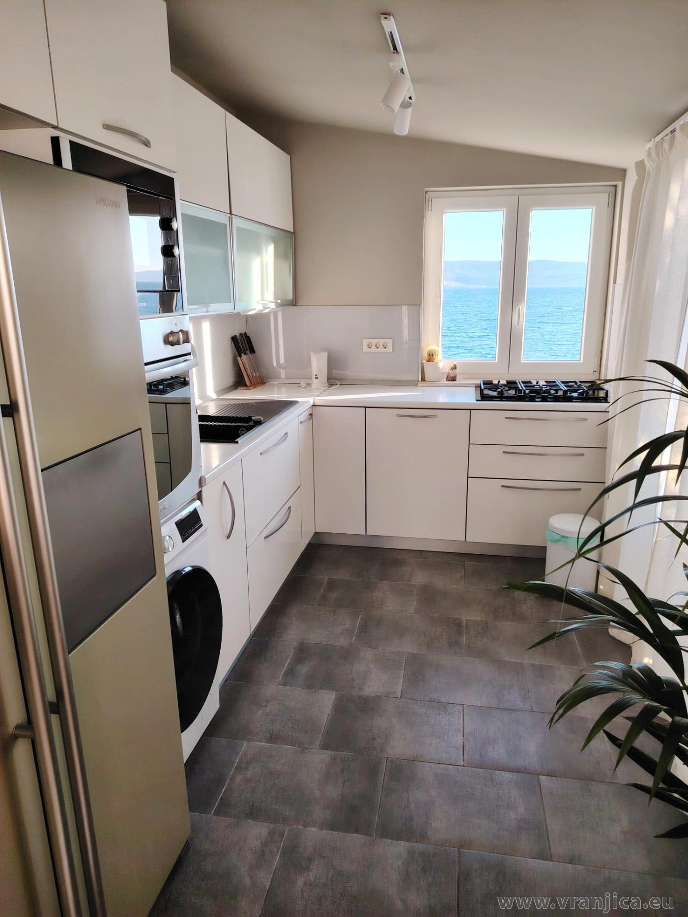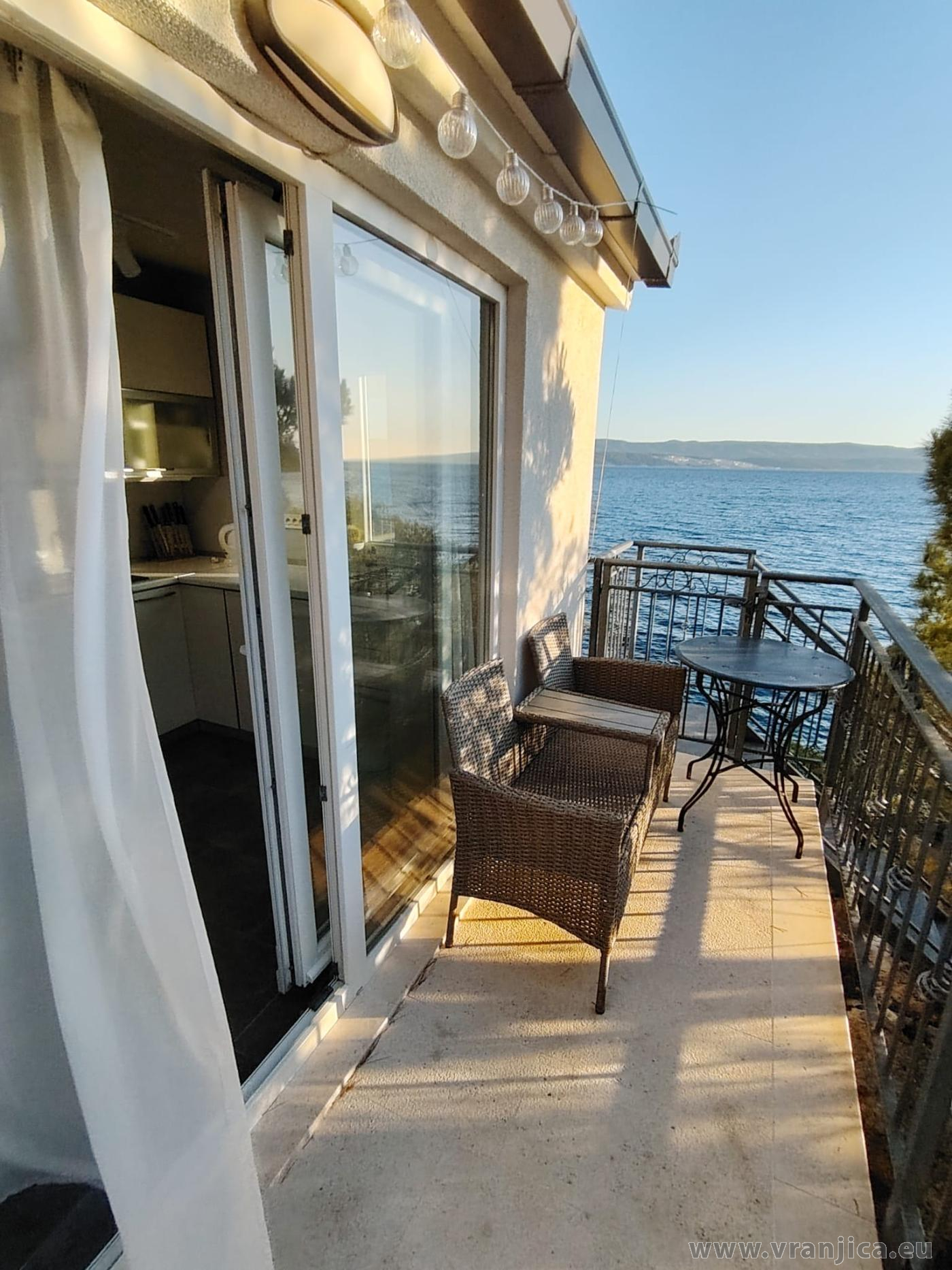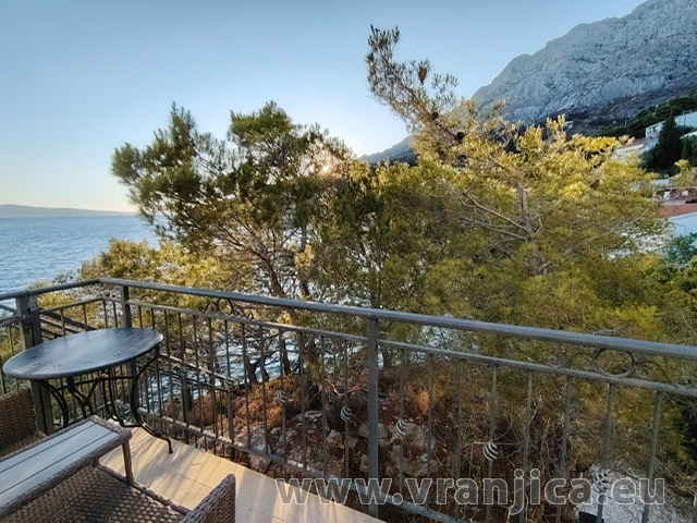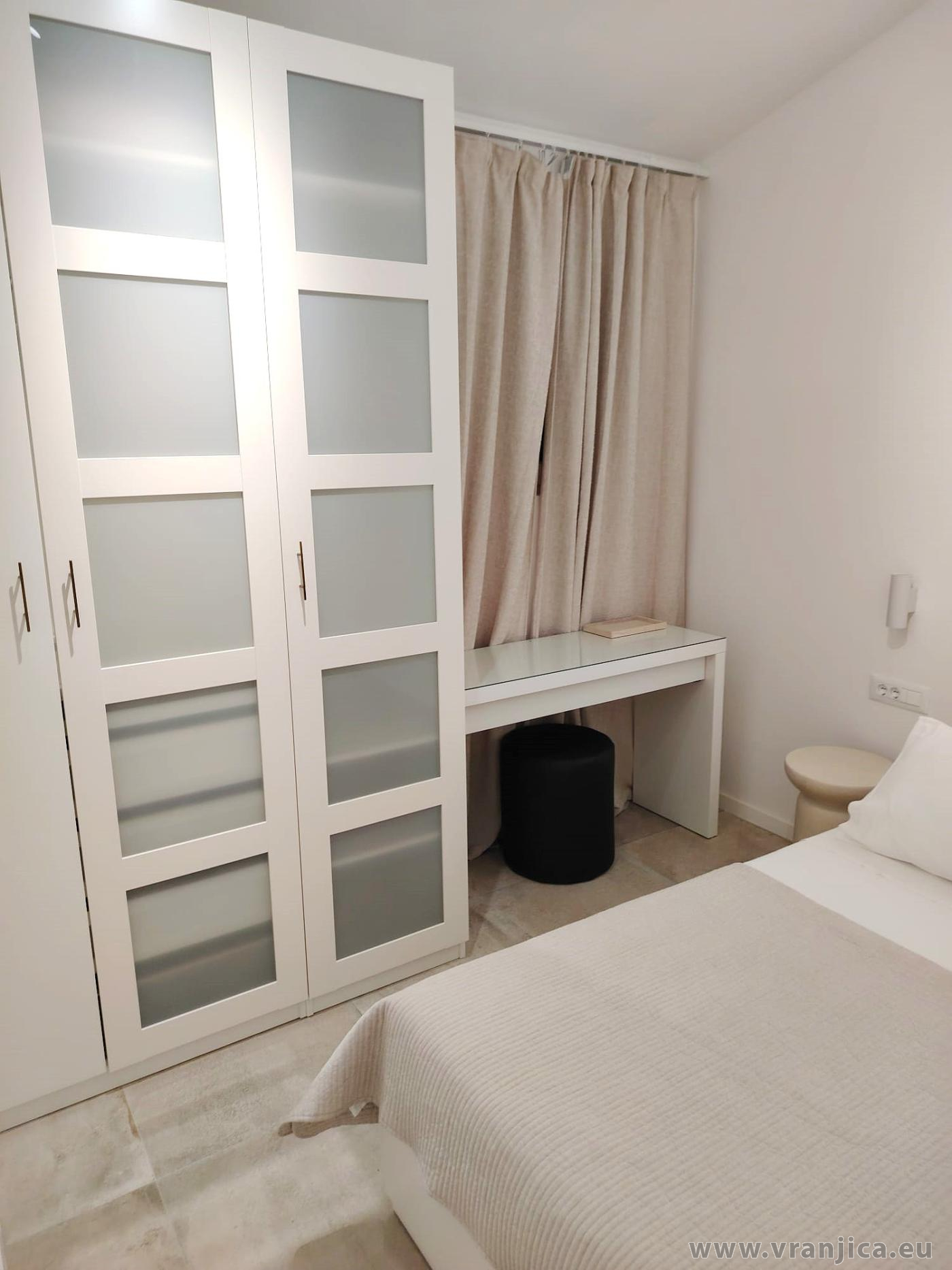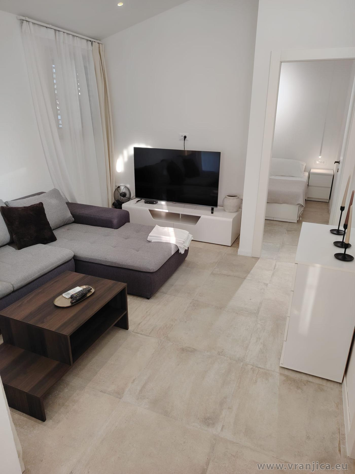 AP1 (2+2) pro 4 osoby: 2. patro, levá boční strana vily, 1 ložnice (dvoulůžko 160x200 cm), obývací pokoj + kuchyně (1x rozkládací dvoulůžko 160x210 cm), koupelna (WC, sprcha), terasa s výhledem na moře, plocha 55 m2 + boční terasa 5 m2. Informace o objektu ZDE.